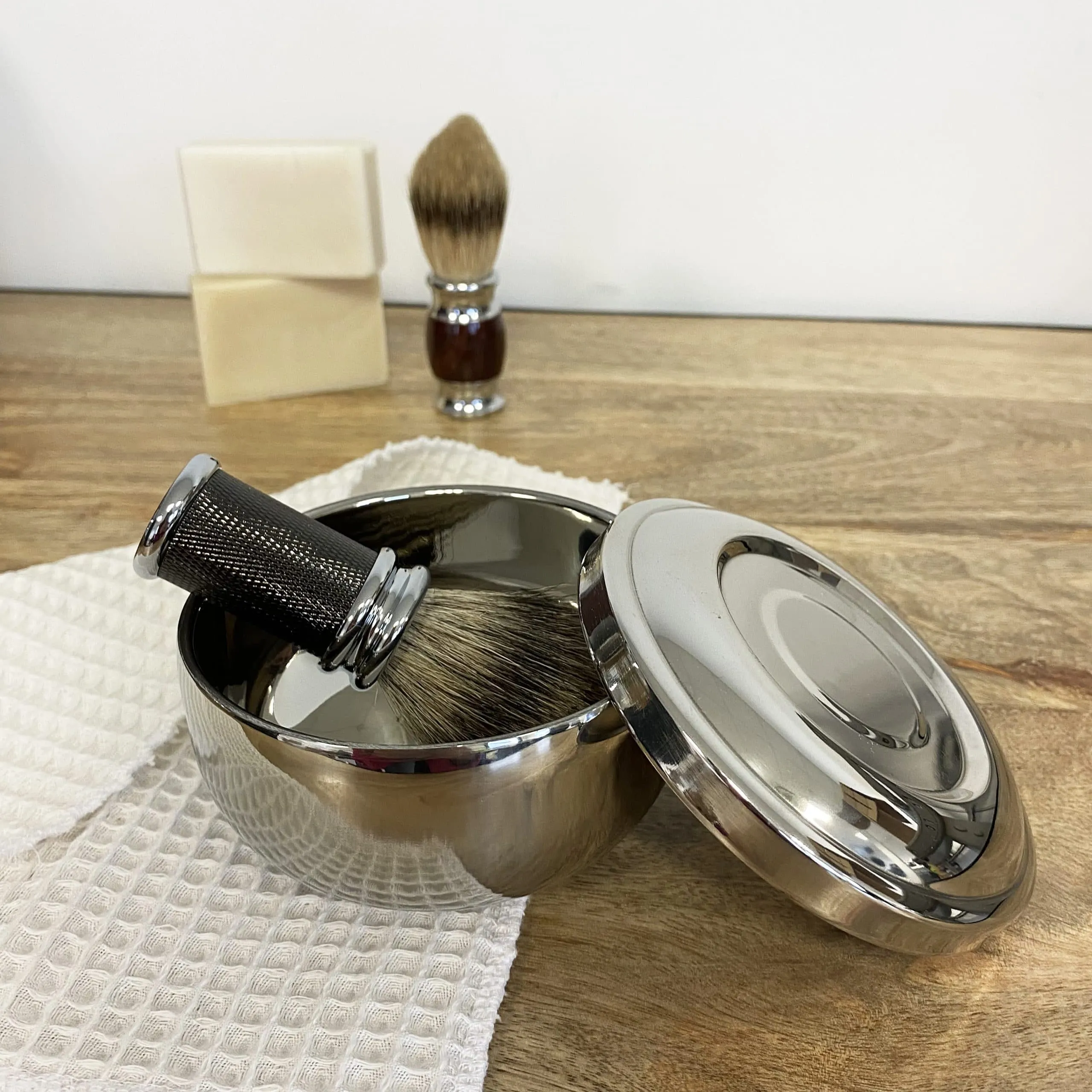 6. Rincez votre bol sous l’eau pour retirer le surplus de mousse, bien le sécher à l’aide d’un chiffon, replacez le savon et fermez le bol jusqu’à la prochaine utilisation.