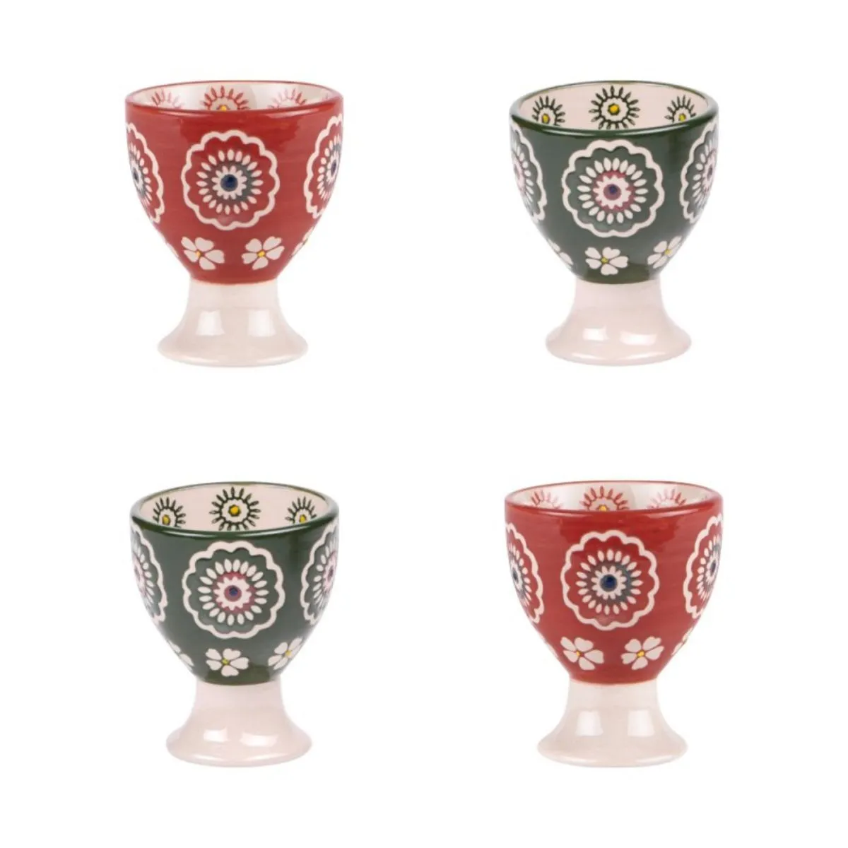 Retrouvez deux coquetiers de couleur rouge et deux autres de couleur verte ainsi que des motifs floraux sur l’ensemble des produits. Leur praticité, offre un maintien parfait pour savourer vos œufs à la coque avec élégance. Leur format compact et robuste garantit une utilisation agréable et durable.