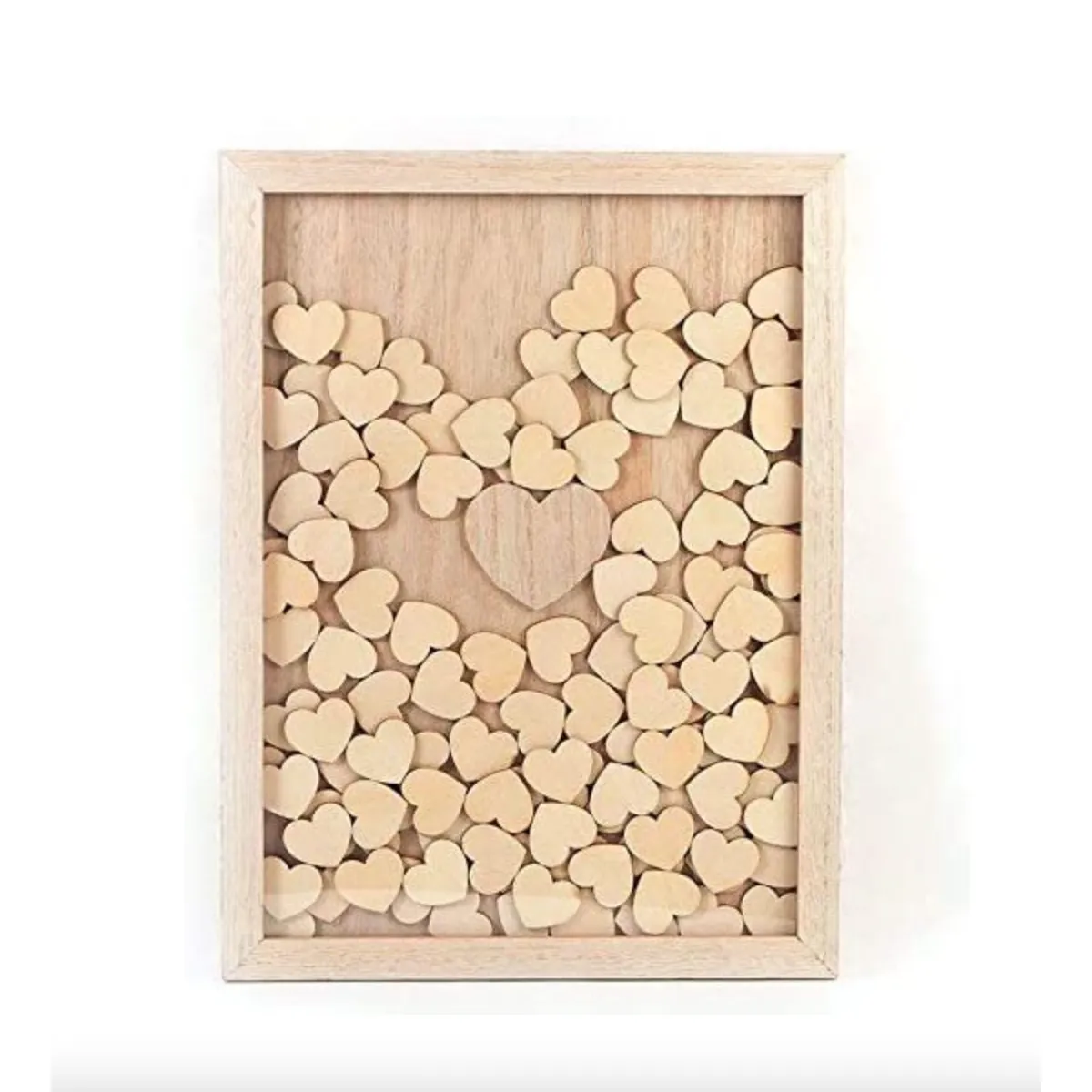 Voeux de bonheur, petit mot d’amour, anecdote à inscrire sur le petit coeur en bois qui viendra se glisser dans le cadre à souvenirs.