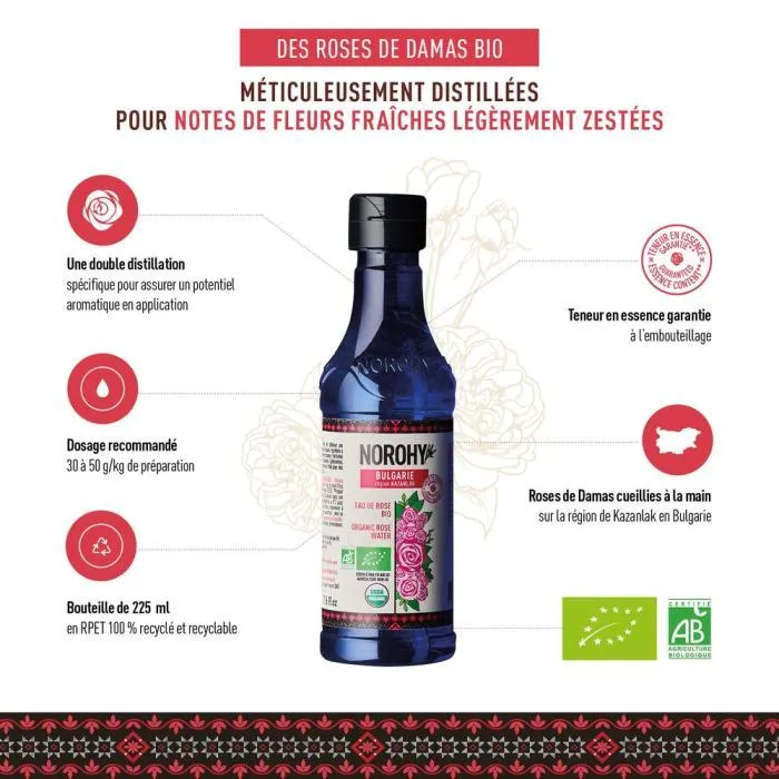 L’Eau de Rose Bio de Norohy, conditionnée en bouteille de 225 ml, provient de la région renommée de Kazanlak en Bulgarie, aussi appelée la Vallée des Roses. Spécialement conçue pour les professionnels, cette eau florale est obtenue à partir de roses Damascena, cueillies à la main et distillées avec soin pour capturer toute l’essence de leurs arômes.