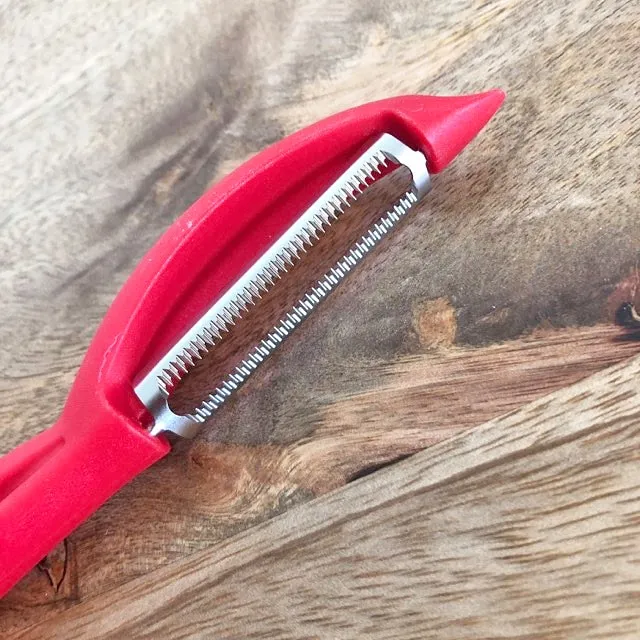 PRATIQUE : Avec les économes classiques à dents lisses il est souvent difficile d’éplucher les fruits et légumes à peaux épaisses sans en abimer la chaire. Ici grâce aux lames dentelées la peau va être bien saisie et l’épluchage parfait.