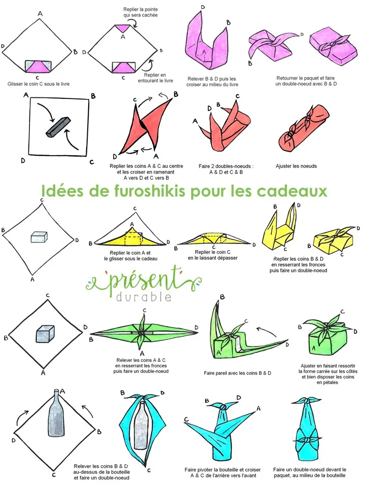 Le Furoshiki, c’est avant tout pratique et rapide d’utilisation. Il peut être utilisé pour transporter de nombreux objets, comme des livres ou des bouteilles. Retrouvez sur le visuel ci-dessous les différentes techniques de pliages possibles :