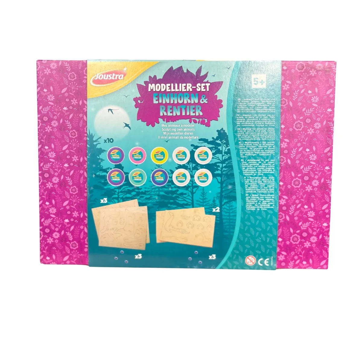 - 10x Pots de pâte à modeler (4 blancs, 1 rose, 2 violets, 1 vert, 1 jaune, 1 bleu)