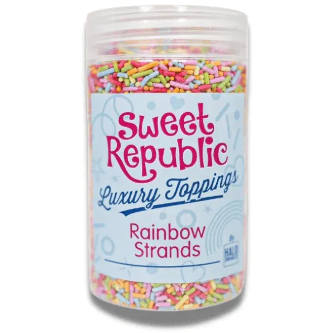 Vermicelles Rainbow : Sucre glace [sucre, amidon], amidon de MAÏS, graisse végétale non hydrogénée [palme], eau. émulsifiant ; lécithine de colza. Glaçure [agents de glaçage; (gomme laque, gomme d’acacia), sucre]. Couleurs; E129, E102, E132, E110, E122, E124, E151.