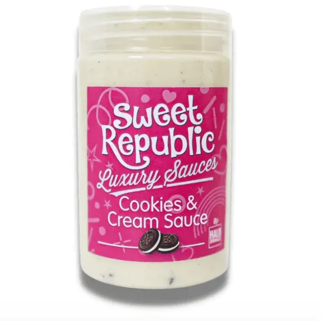 Sauce Cookie and Cream : Sucre, huile de tournesol, LAIT entier en poudre, lactosérum en poudre, cacao majordome, dés de coca (BLÉ, farine, sucre, huile végétale, [huile de tournesol à haute teneur en acide oléique], cacao en poudre, sirop de glucose et de fructose, poudres à lever (hydrocarbonate d’ammonium et carbonate acide de sodium), sel, émulsifiant (SOJA, lécithine), arômes de vanille (LAIT) et antioxydant (E-304i, E-306).