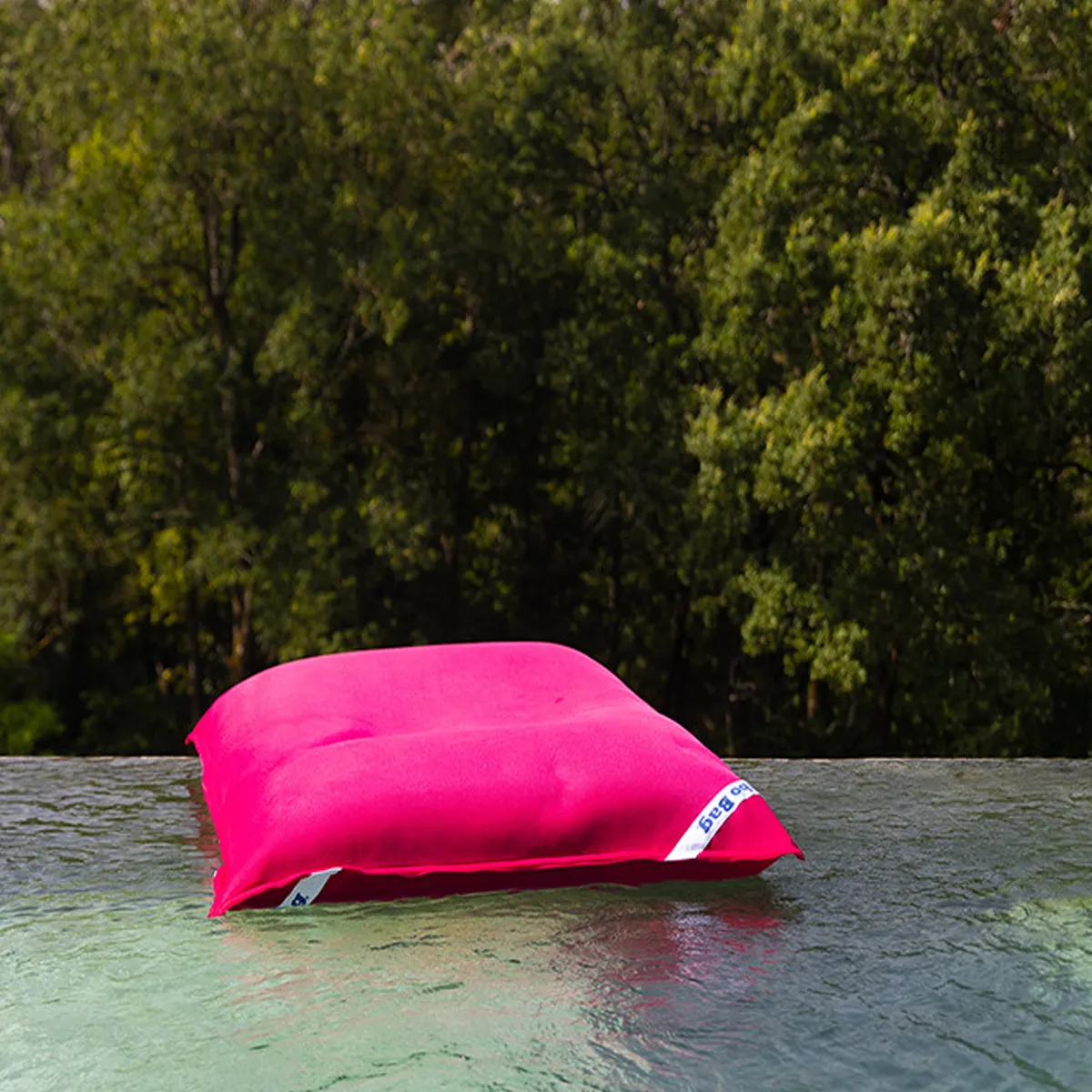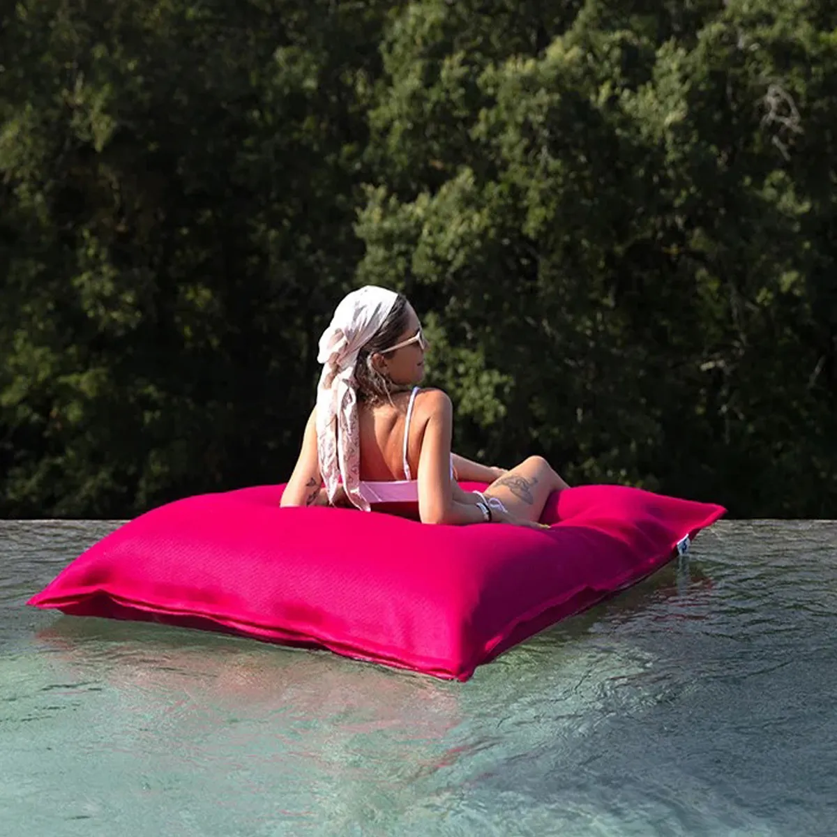 Pouf géant flottant pour piscine rose fuschia aux couleurs vives et estivales.