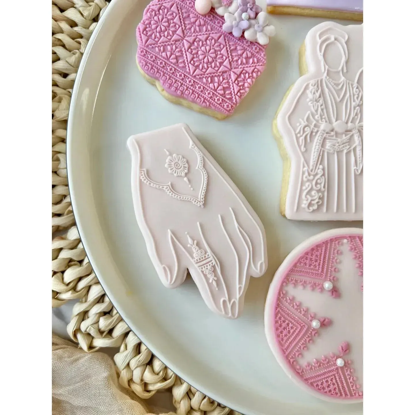 Ajoutez une touche traditionnelle et élégante à vos créations pâtissières avec ce tampon 3D Main Henné et rendez vos événements inoubliables ! 🍪🌺