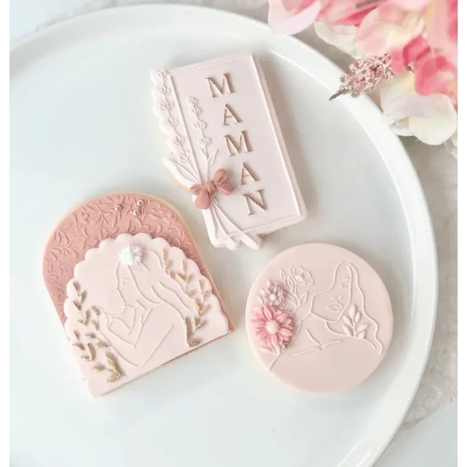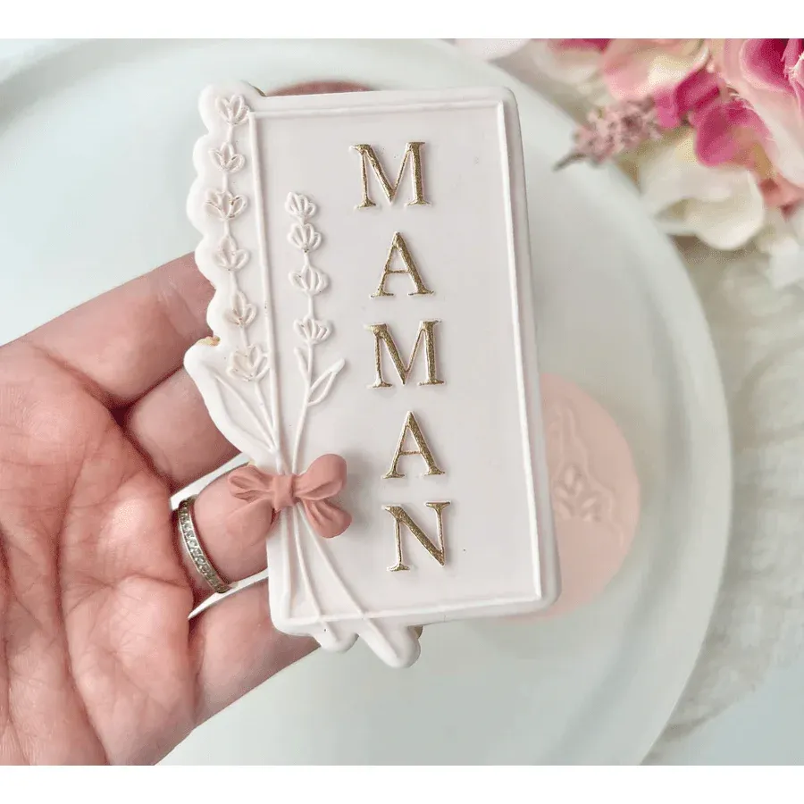 Faites plaisir à votre maman en créant des biscuits et des gâteaux personnalisés pour la fête des mères avec ce tampon embosseur « Maman » et feuilles de lavande. Commandez dès maintenant pour ajouter une touche d’amour à vos créations pâtissières !